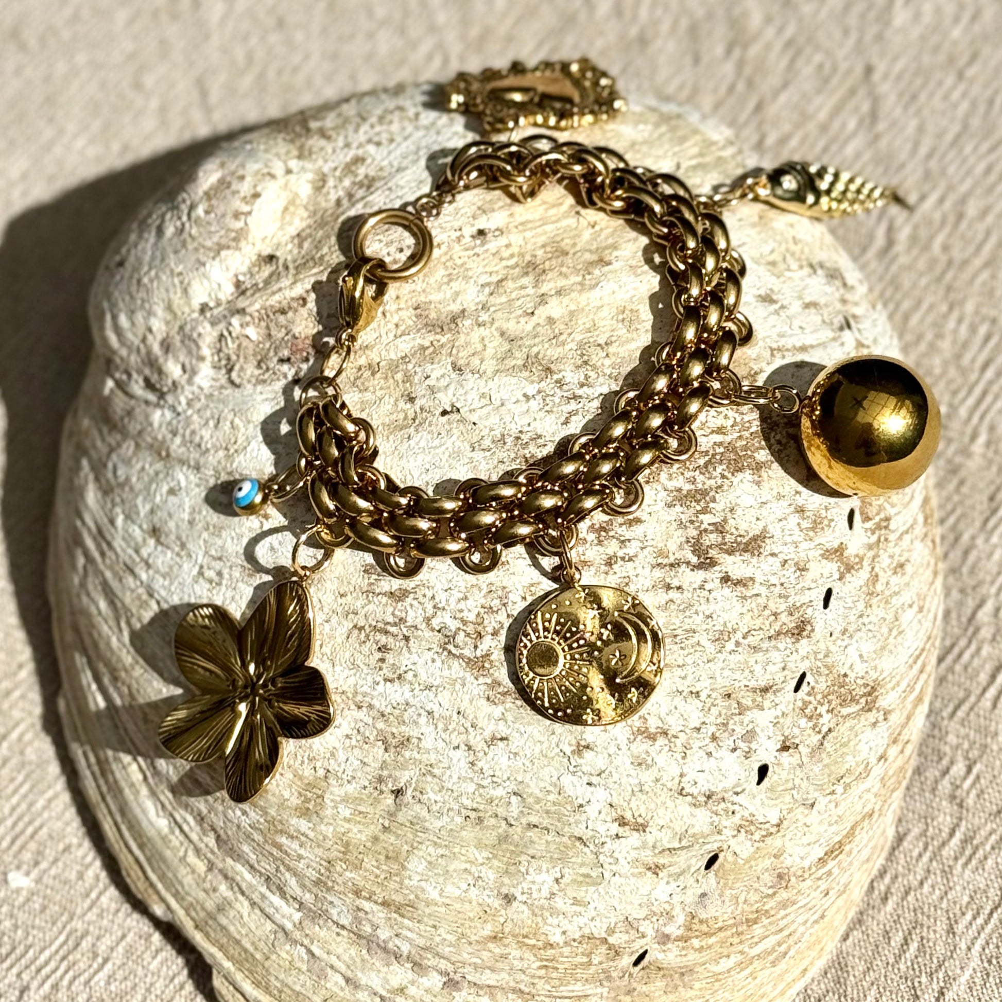 Large statement 18ct gold plated heart | fish | brass ball | mystic moon | flower | blue evil eye