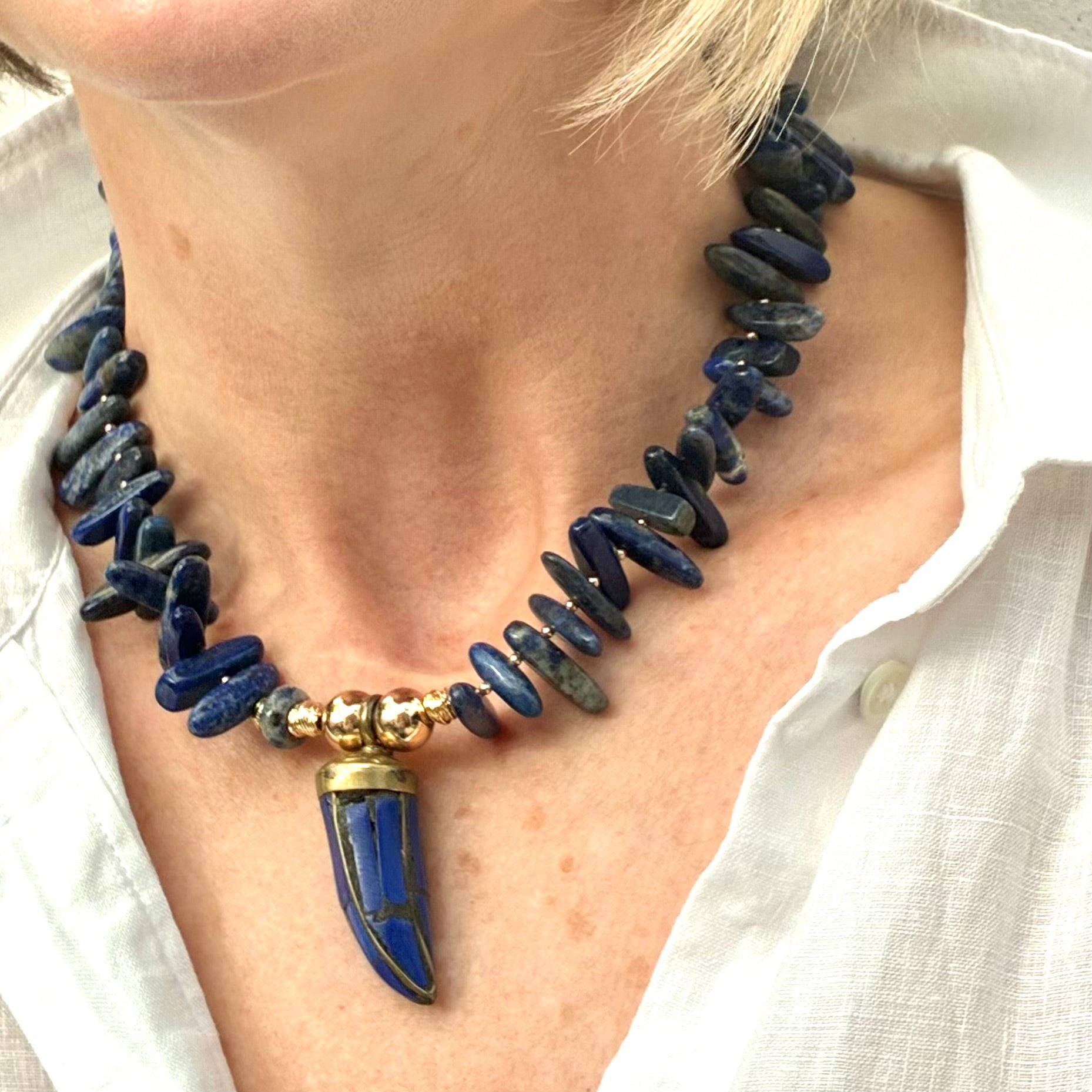 Lapis lazuli with lapis lazuli tooth pendant semi-precious necklace