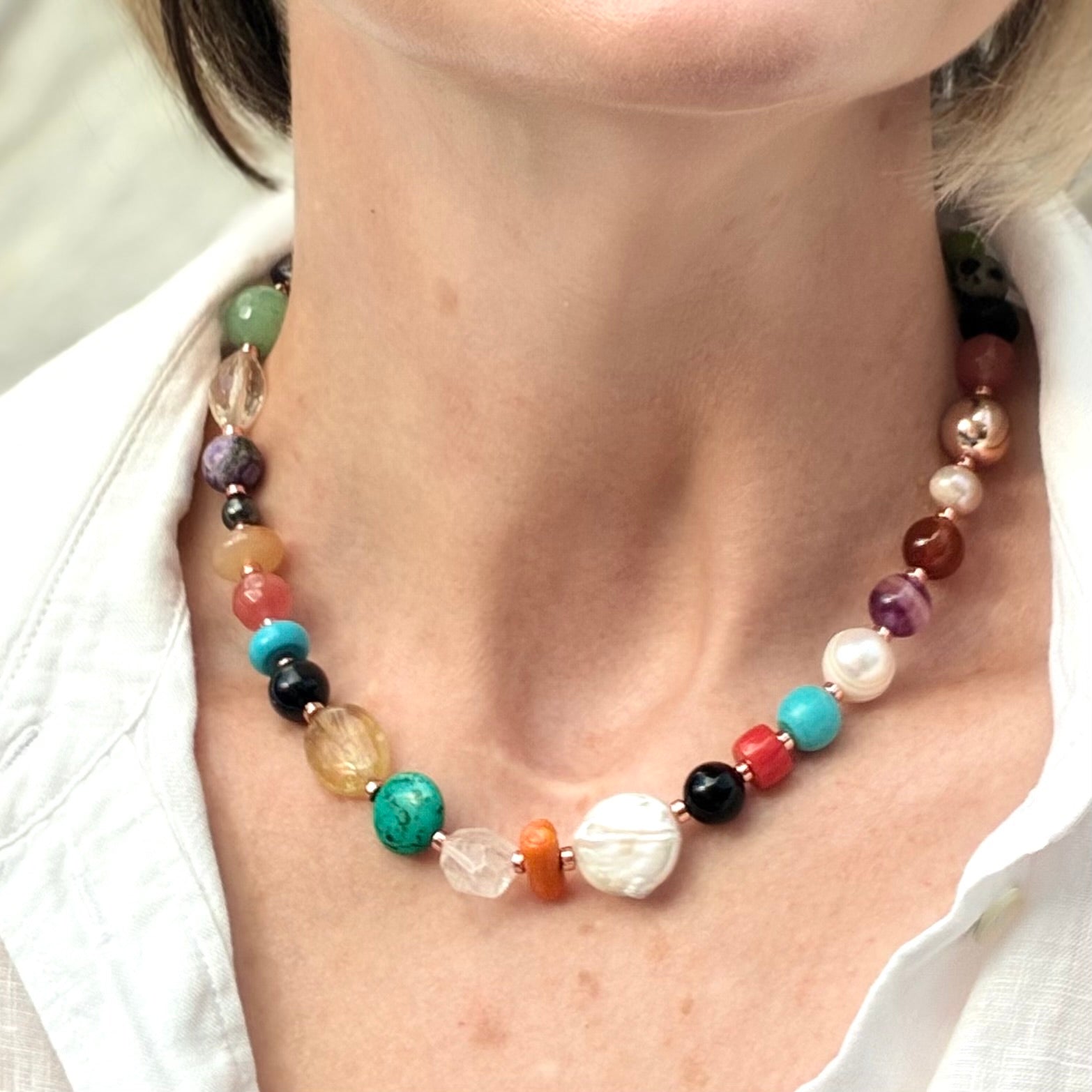 Freshwater pearls, quartz, turquoise, bluestone, agate, amethyst, jade, coral, aquamarine, dalmatian jasper, hematite semi-precious necklace