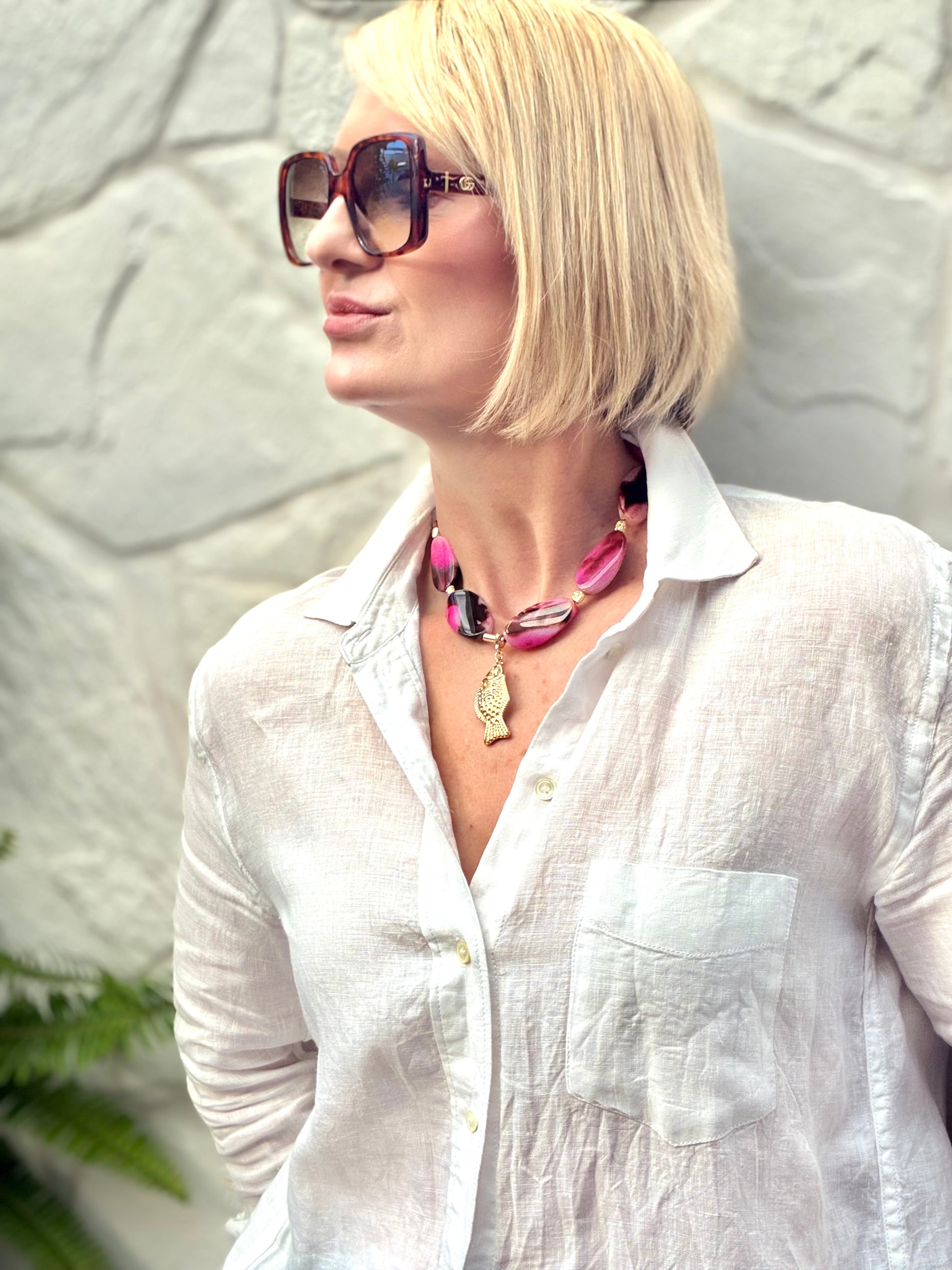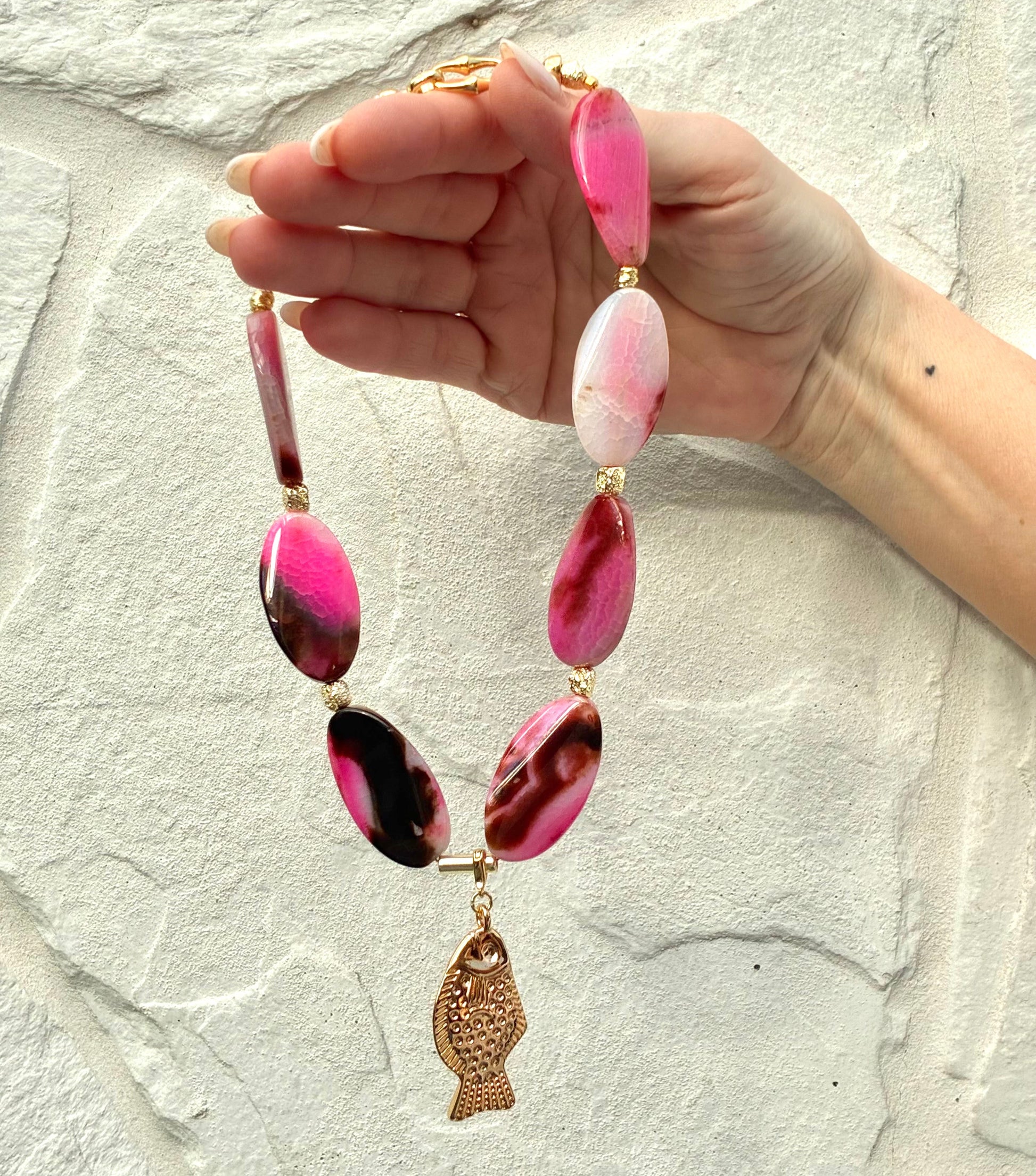 Pink agate semi-precious necklace with a large removable 18ct gold plated fish pendant