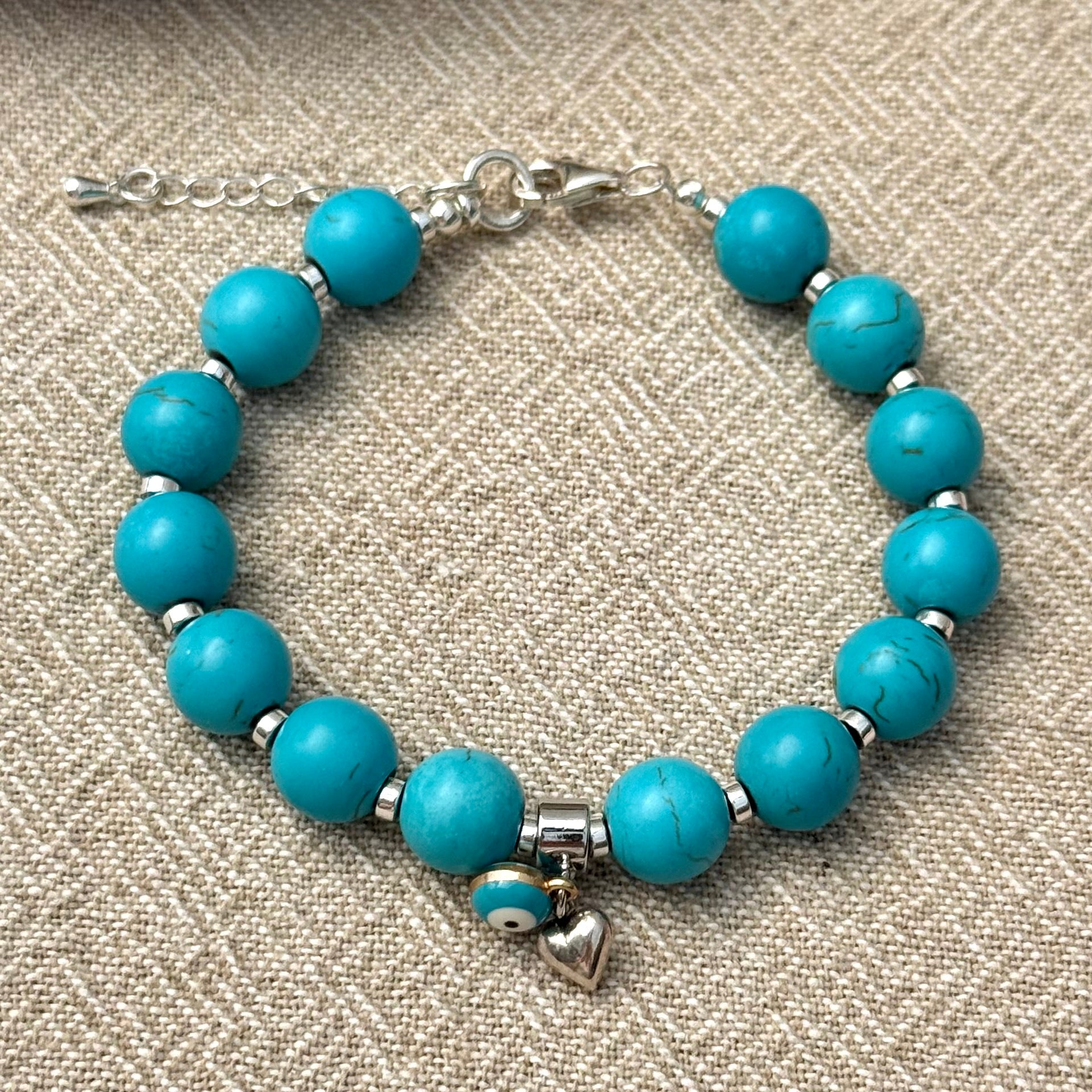 Turquoise, sterling silver heart and blue evil eye charm bracelet